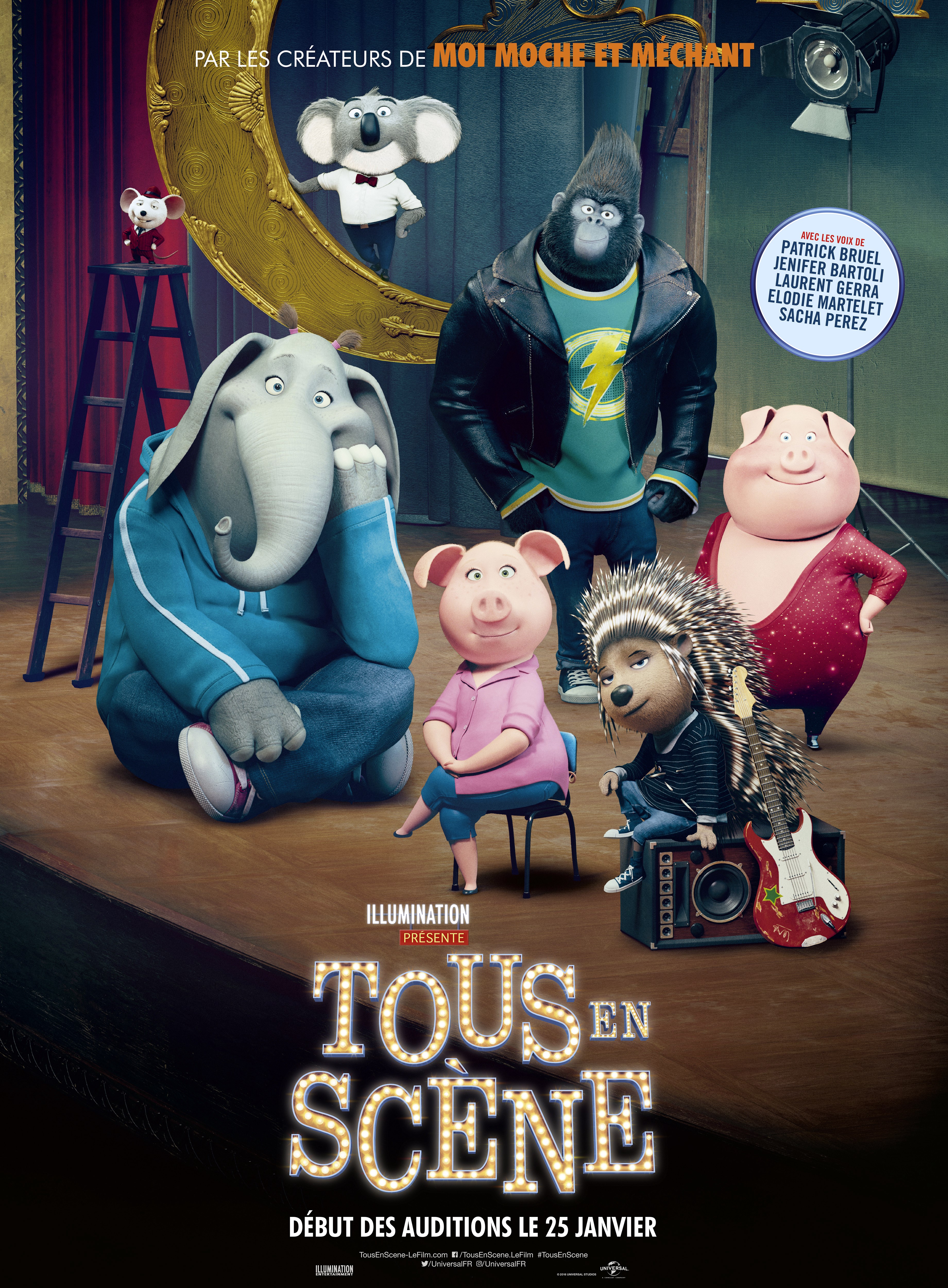 Synopsis : Buster Moon est un élégant koala qui dirige un grand théâtre, jadis illustre, mais aujourd’hui tombé en désuétude. C’est un éternel optimiste, un peu bougon, qui aime son précieux théâtre au-delà de tout et serait prêt à tout pour le sauver. C’est alors qu’il trouve une chance en or pour redorer son blason tout en évitant la destruction de ses rêves et de toutes ses ambitions : une compétition de chant. Cinq candidats sont retenus pour ce défi : une souris aussi séduisante que malhonnête, une jeune éléphante timide dévorée par le trac, une truie mère de famille débordée par ses 25 marcassins, un jeune gorille délinquant qui ne cherche qu’à échapper à sa famille, et une porc-épic punk qui peine à se débarrasser de son petit ami à l’ego surdimensionné pour faire une carrière solo. Tout ce petit monde va venir chercher sur la scène de Buster l’opportunité qui pourra changer leur vie à jamais.