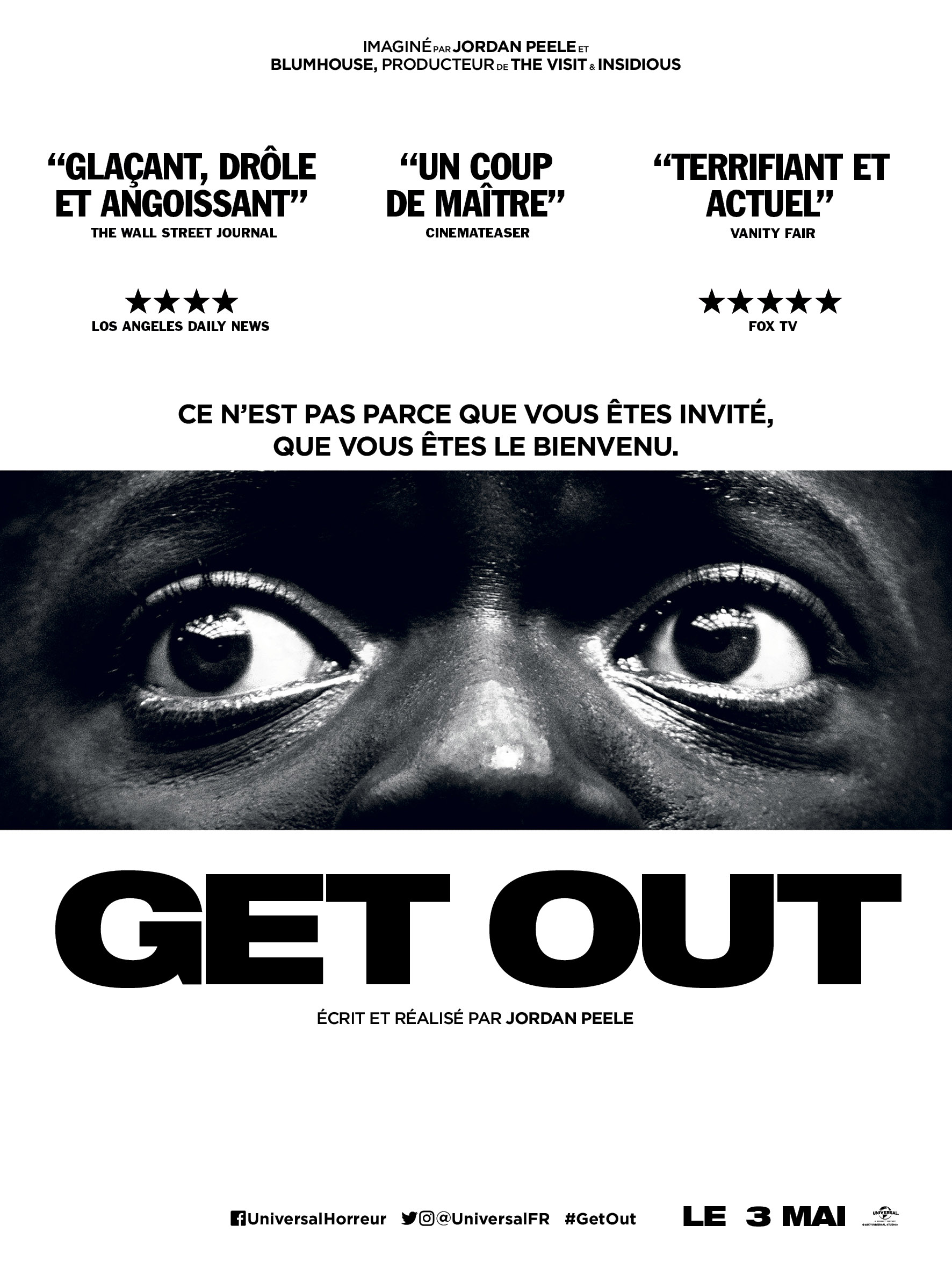 Synopsis : Couple mixte, Chris et sa petite amie Rose filent le parfait amour. Le moment est donc venu de rencontrer la belle famille, Missy et Dean lors d’un week-end sur leur domaine dans le nord de l’État. Chris commence par penser que l’atmosphère tendue est liée à leur différence de couleur de peau, mais très vite une série d’incidents de plus en plus inquiétants lui permet de découvrir l’inimaginable.